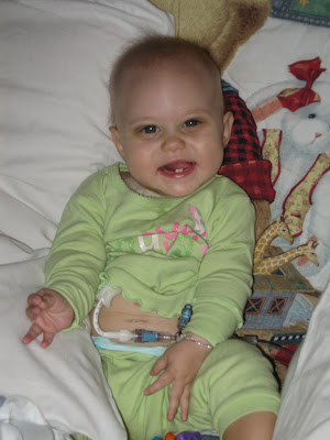Here's an update of Breezy's most recent chemo treatment. We took her in on Friday night (after waiting all day for them to call us in to the hospital...ugh!) and she started her pre-drugs at 8pm. (Pre-drugs are to help her with any nausea or adverse reactions she may feel during the chemotherapy) Then she was able to start the chemo at 9:30pm. She received 3 drugs over about 3 hours...they were Carboplatin, Cyclophosphamide & Doxorubicin. We were told that this round would be really intense because of all the drugs given at one time. Bree did really well while the chemo entered her body yet had a hard time going to sleep that night. I think she's had it with hospital beds. :) We stayed in the hospital through Saturday afternoon then got to go home. Yea! They sent us home with Neupogen shots that I have been giving her in her thighs. Yes, I have to give her a shot a day! ☹ Neupogen will help her body build its own neutrophils (immune fighting cells). It's hard for me to give a shot to my baby, and I really hate doing it, but if it will help her stay healthy and out of the hospital, I'll do it! For now she is doing pretty well. She's vomitted about 5 or 6 times but it hasn’t been as much as the last treatment so our goal this time around is to keep her hydrated, happy and healthy. Ironically after she vomits, she still smiles and laughs. What a little angel she is! That's easy Breezy! We honestly believe she has done so well this time because of the prayers from so many people. We do recognize our Heavenly Father's hand in helping her & believe He will carry her through these chemo treatments. My good friend told me the angels are with these little ones blessing them and protecting them during these trials and I certainly believe it because she has been such a strong little fighter!